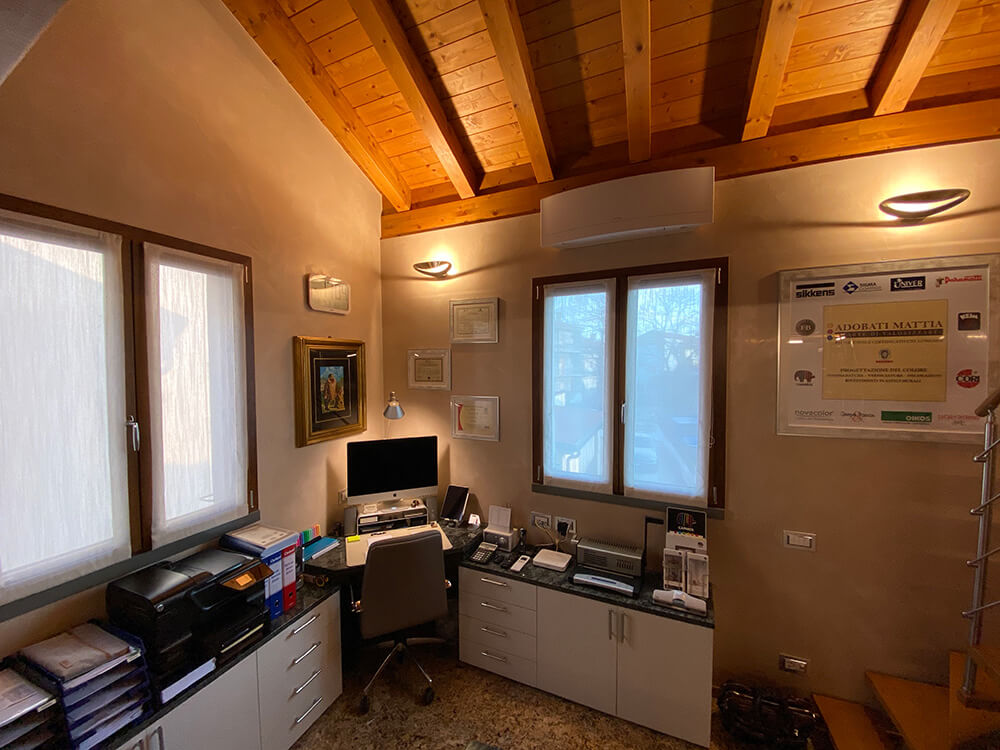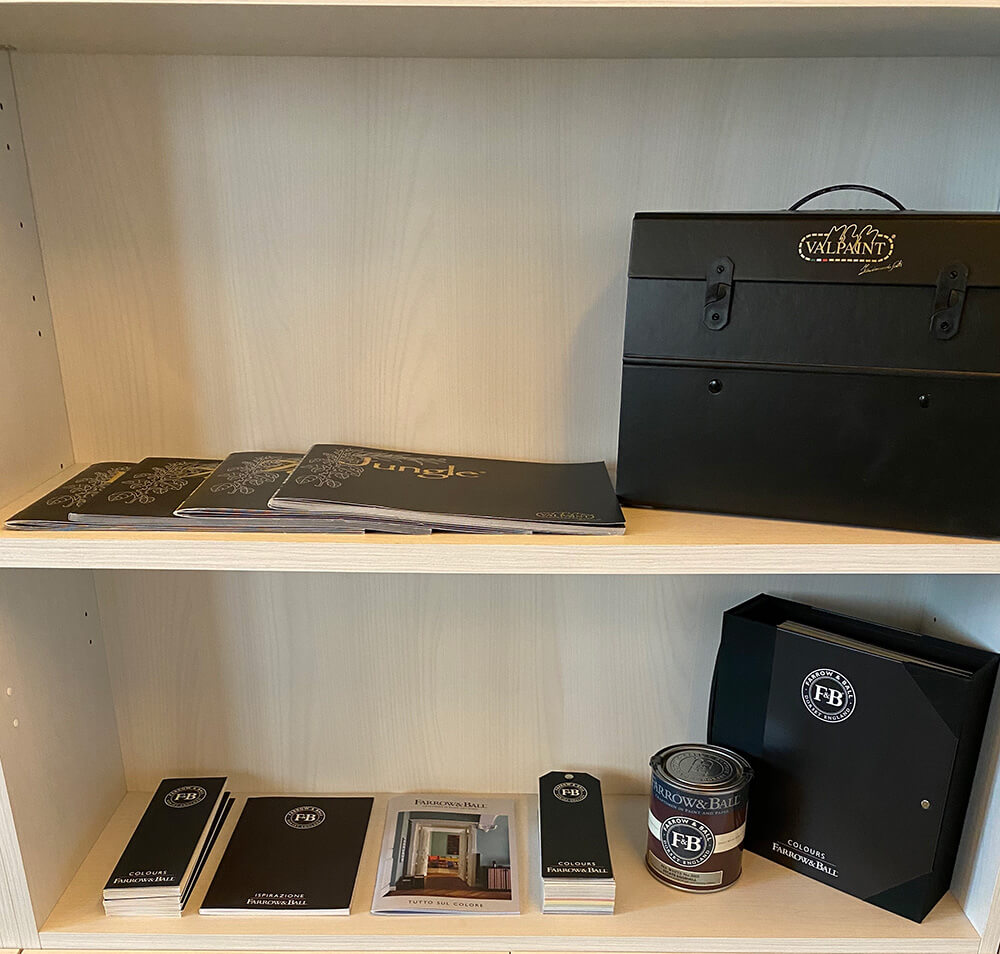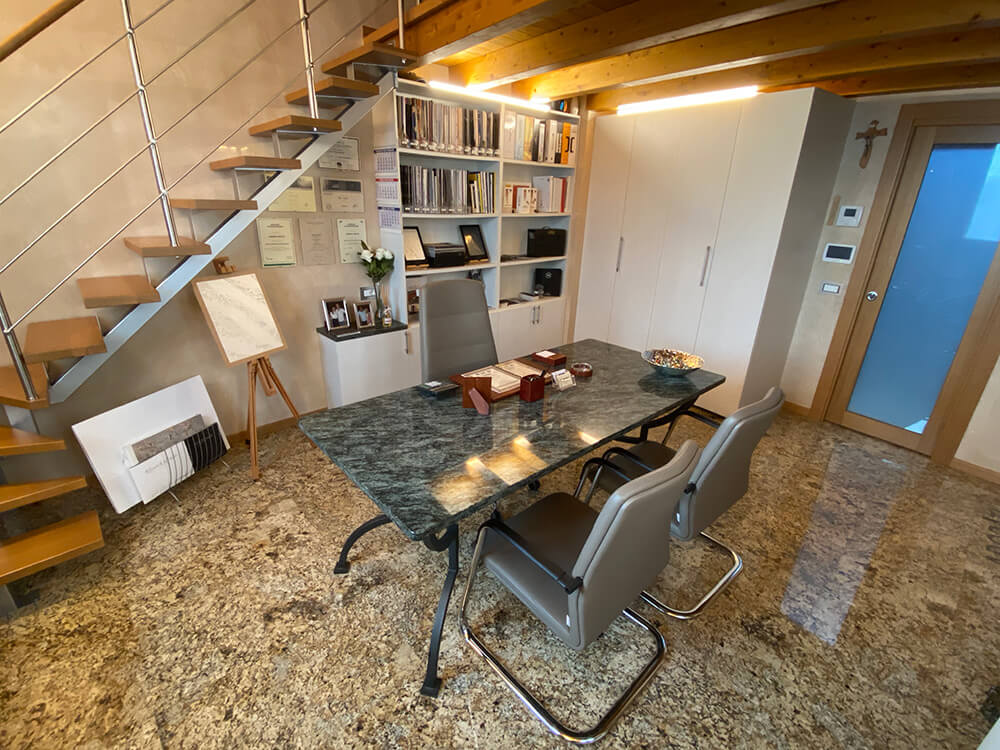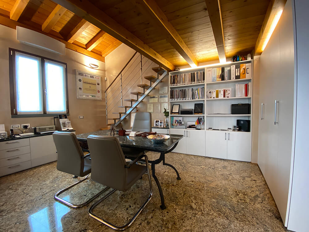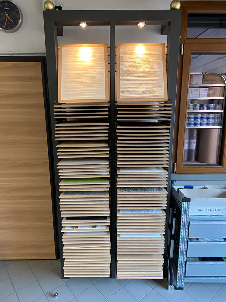 Qui trovano spazio lo studio per la progettazione del colore e l’ufficio che si occupa della parte amministrativa e contabile. Si predispongono inoltre un laboratorio espositivo, dove vengono esposte e realizzate le campionature delle texture, e un deposito in cui vengono riposti i materiali e le attrezzature necessarie all’esecuzione dei lavori.