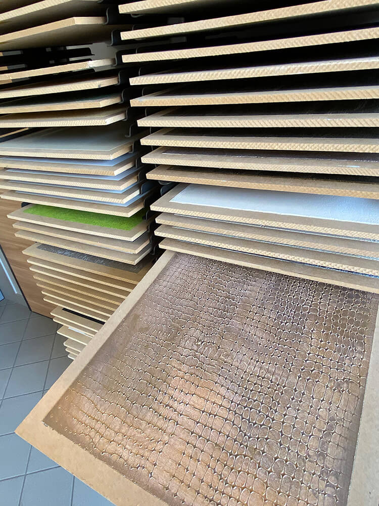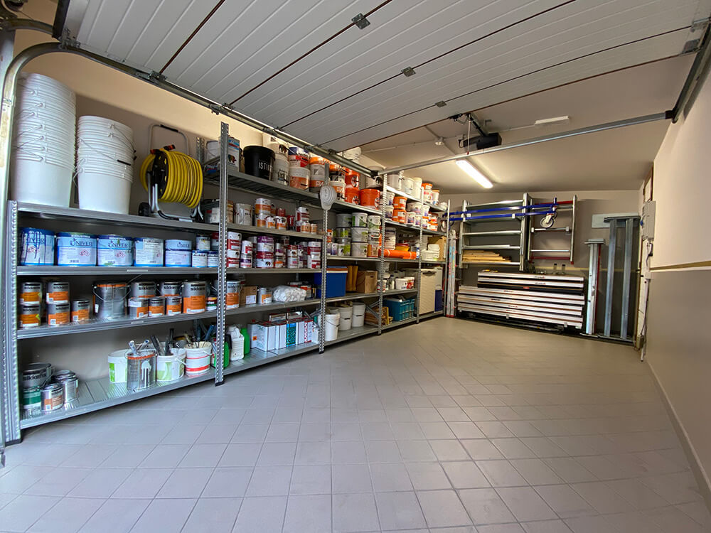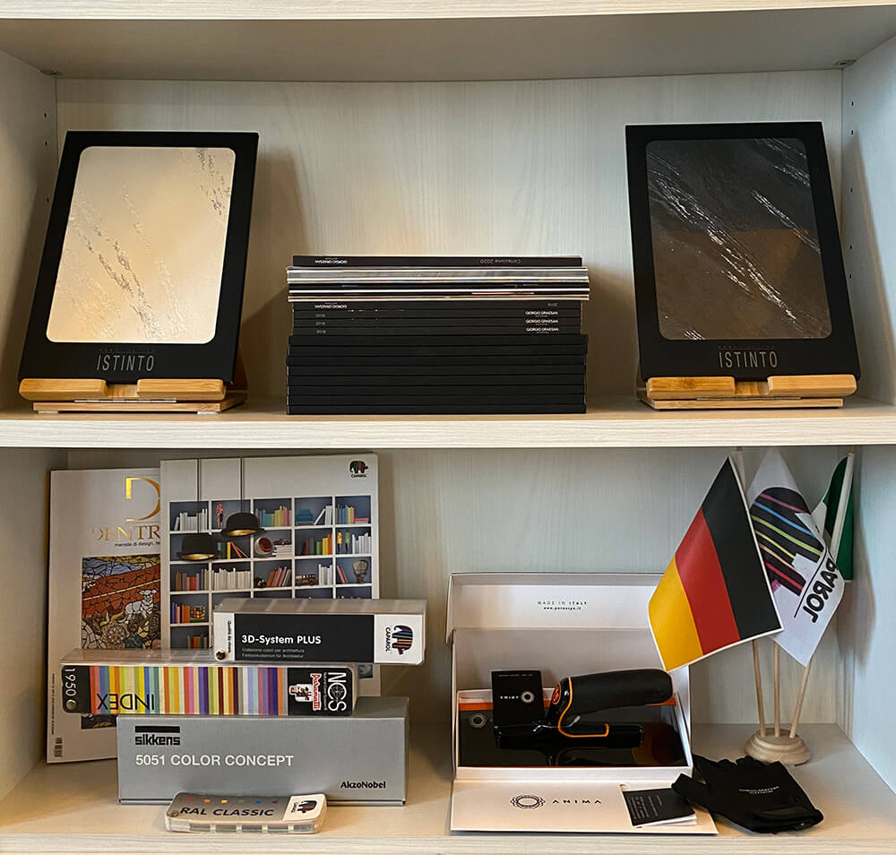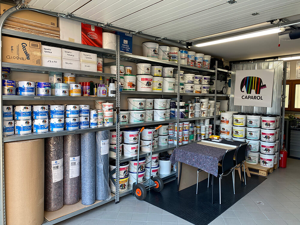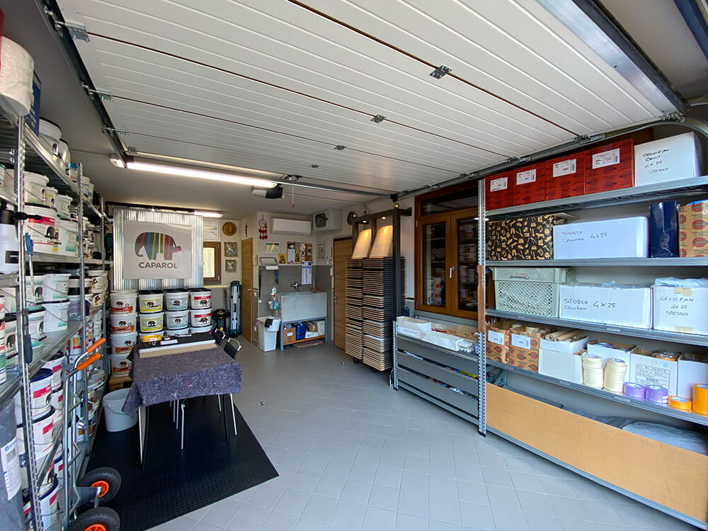 Qui trovano spazio lo studio per la progettazione del colore e l’ufficio che si occupa della parte amministrativa e contabile. Si predispongono inoltre un laboratorio espositivo, dove vengono esposte e realizzate le campionature delle texture, e un deposito in cui vengono riposti i materiali e le attrezzature necessarie all’esecuzione dei lavori.